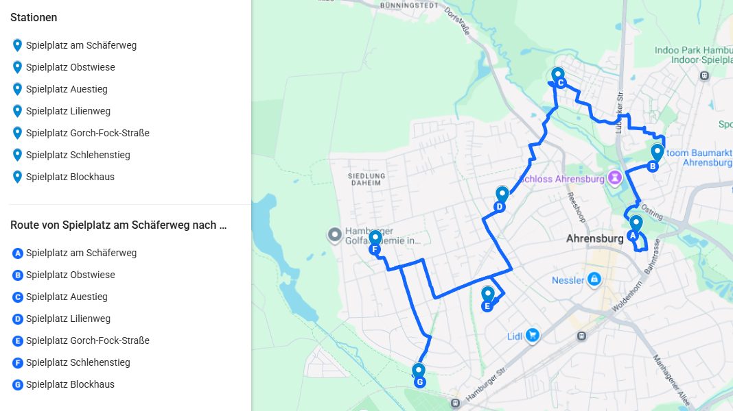 Hinweis: Die "falschen" Spielplätze können in beliebiger Reihenfolge besucht werden. Der "richtige" Spielplatz Blockhaus sollte am Ende besucht werden. Das Ziel ist es, dass die Kinder Kombinatorik nutzen, um anhand der Merkmale die falschen Spielplätze auszuschließen. Eine Tabelle um bei Bedarf die verschiedenen Merkmale zu notieren ist im Downloadbereich verfügbar.